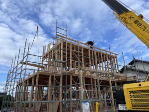 新築、上棟日当日の様子です。お施主様にお清めをしていただきスタートした上棟。昨今、棟おさめも危ないと言われていますが、私たちはお施主様のご意向を確認し安全を確認し、棟おさめをさせて頂いております。いい思い出にしていただきたいと思っております。