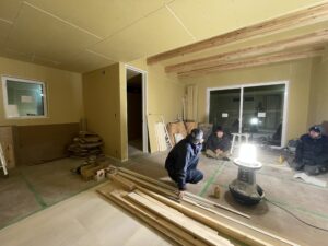 シートが完成すると休む間もなく、大工のYさん、床をどんどん張り進めていきます。