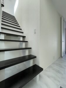黒い踏板で、リビングない階段でもお部屋の雰囲気を壊さない