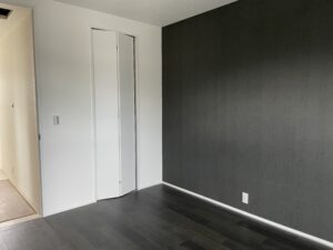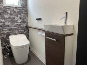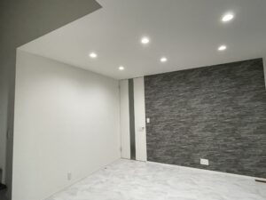 『耐震等級3は絶対!』とご相談にこられたI様。耐震等級3プラス制震ダンパーを付け地震に強いお住まい。わんちゃん・ねこちゃんも一緒に生活されるという事で一階は全てフロアタイル。石目調のアクセントクロスで高級感のあるリビングです。