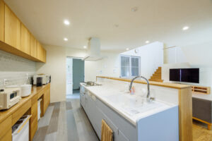 全て造作背面収納と綺麗な水色のキッチン
